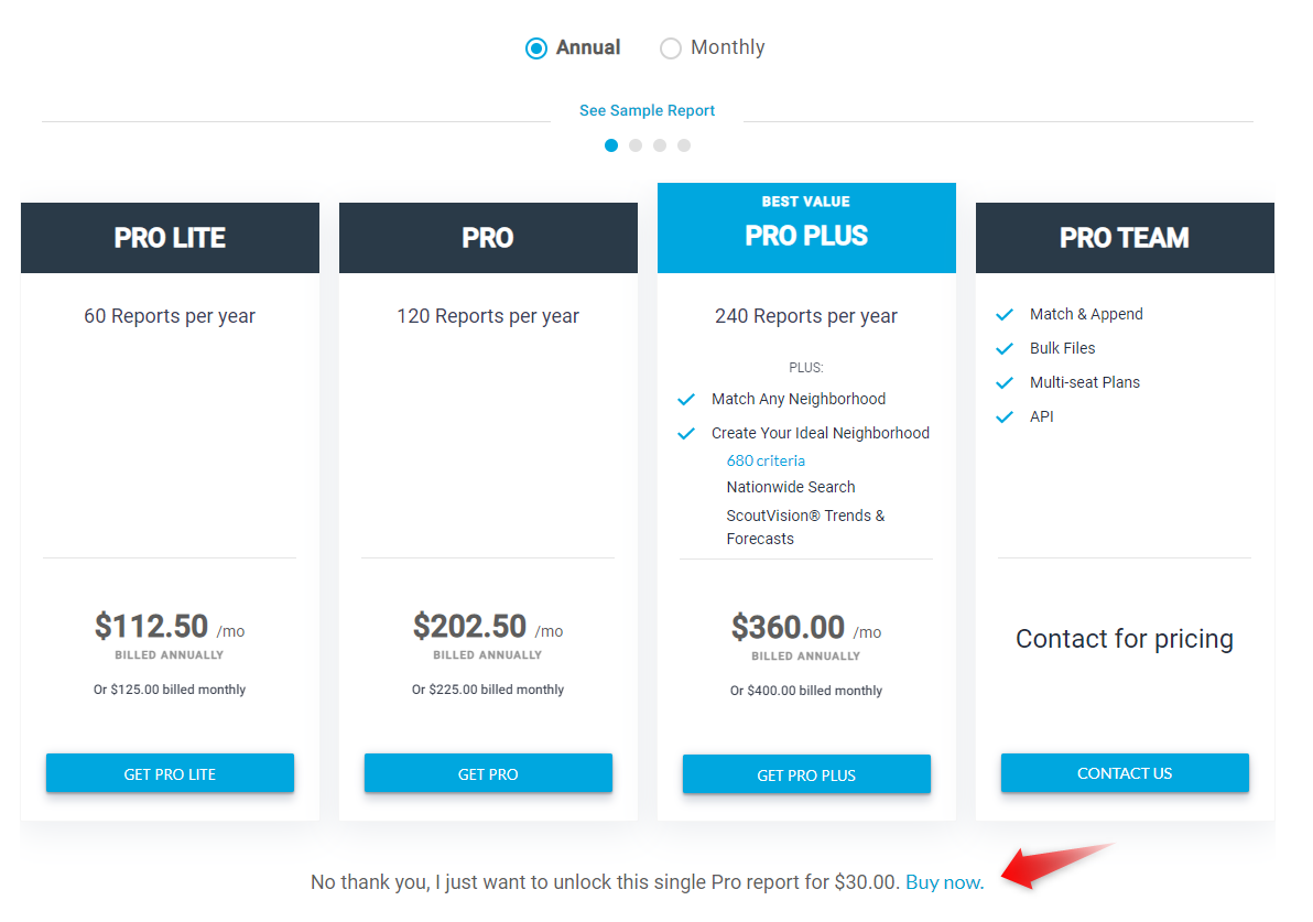Simply click BUY REPORT on any report you would like to purchase. You will find the link to purchase the individual Pro report below the subscription options: